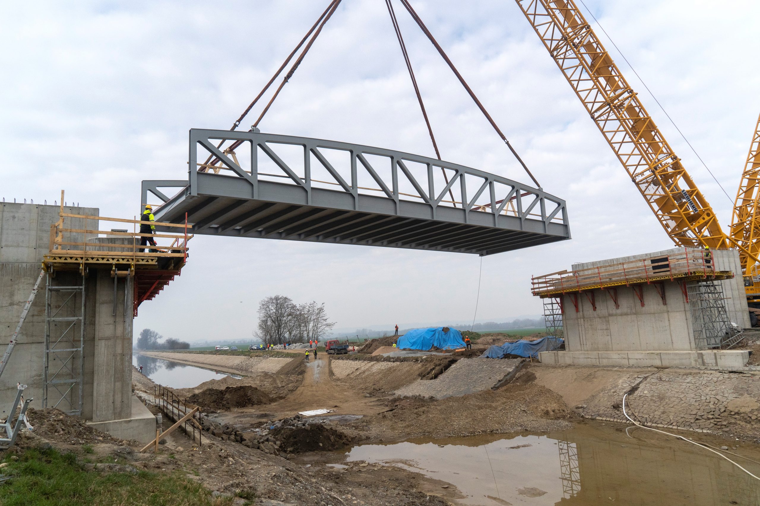 Nový ocelový most byl sestaven a svařen z dílů na levém břehu plavebního kanálu. Ve čtvrtek 19. března mobilní jeřáb o největší nosnosti v České republice zvedl celý most délky 36 m a šířky 11 m o hmotnosti 152 tun, otočil o 90° a osadil na připravené nové železobetonové pilíře. Za 11 dnů se do plavebního kanálu vrátí voda a most se bude klenout 7 m nad její hladinou. Silnice III. třídy do Lužce nad Vltavou bude přeložena na tento nový most a původní 115 let starý most, který je dnes v havarijním stavu, již nebude svou výškou pouhých 4,5 m tvořit překážku plavbě lodí do Prahy.